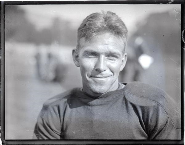 This is a collection of glass plate negatives (18) from the 1929 Cal Golden Bear football team. They are 4" x 5" in size and in EX condition. Five of them feature Roy Riegels, aka "Wrong Way" Riegels. He was given his nickname for what he did when the Cal football team played Georgia Tech in the 1929 Rose Bowl. Cal's defense forced a Georgia Tech fumble and Cal center Roy Riegels recovered the ball and headed towards the opposing GT end zone for a TD. Unbelievably, before getting there, he turned around and headed in the other direction towards his own end zone. Riegels got to the Cal (his own) one yard line before one of his team mates tackled him. Cal elected to punt on the next play however the punt was blocked for a safety and 2 points for GT which turned out to be the decisive points in the GT 8-7 win.
