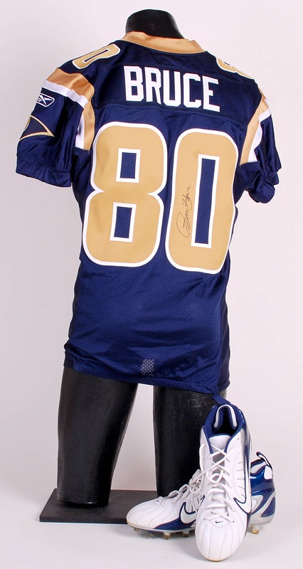 Blue Rams jersey is all original and has name sewn on a plate on the back. Shortened at the bottom with elastic added. Sleeves also have elastic. "05-44 S" tagging in the collar along with Prova Group tag and ID number. Worn in the first game of the 2007 season (Sept. 9th vs. Carolina) with an LOA from Bruce. Light use with some scuffs. Signed on the back. Pair of Nike cleats were worn during the first couple of games of the 2007 season. They show use in the form of grass stains. Both are signed by Bruce and come with his LOA.