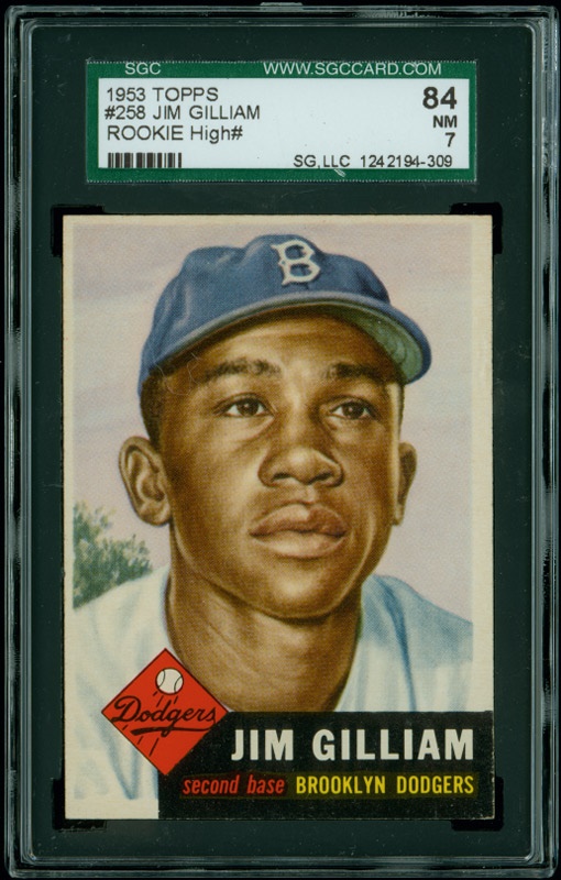 Jim "Junior" Gilliam was named 1953 NL rookie of the year. This is his 1953 Topps (high) # 258 rookie card. It has 70/30 right to left and bottom to top symmetry with nice color. It has clean square corners, and is SGC rated at 84 NM 7.