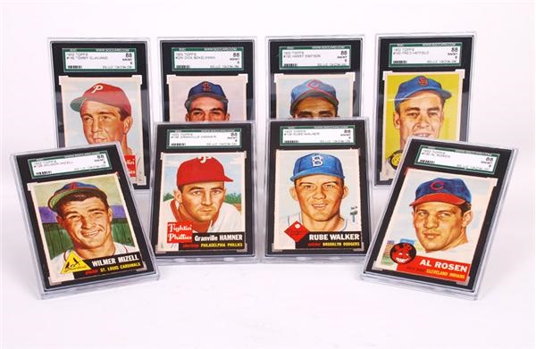 Collection of 15 1953 Topps encapsulated baseball cards. Cards include #163 Fred Hatfield, 150 Harry Simpson, 140 Tommy Glaviano, 204 Dick Bokelmann, 33 Bob Kennedy, 23 Toby Atwell, 193 Mike Clark, 255 Dixie Howell, 26 Dale Mitchell, 209 Jim Greengrass, 8 Clem Koshorek, 128 Wilmer Mizell, 135 Al Rosen, 134 Rube Walker, 146 Granville Hamner. All cards are SGC rated 88 NM/MT 8.