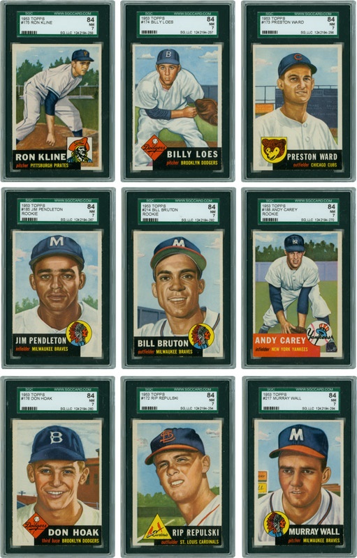 This collection of (18) 1953 Topps baseball cards includes: - #164 Frank Shea - #165 Billy Hoeft - #166 Bill Hunter - #168 Willard Schmidt - #172 Rip Repulski - #173 Preston Ward - (2) #174 Billy Loes - #175 Ron Kline - #176 Don Hoak - #179 Gene Hermanski - #185 Jim Pendleton (Rookie) - #188 Andy Carey - #202 Carl Sawatski - #208 Jim Wilson - #214 Bill Bruton - #215 Gene Conley - #217 Murray Wall The cards have been graded (all as 84 NM 7) and encapsulated by Sportscard Guaranty.