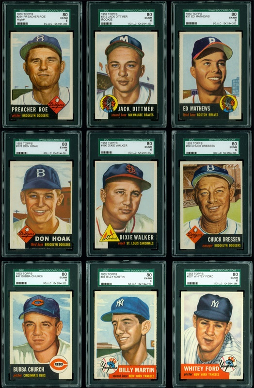 All except for one are graded by SGC 80 EX/NM 6 except for one. Includes EX/NM 6: #184 Hal Brown, #223 O’Brien, #189 Jablonski, #86 Billy Martin, #64 Philley, #50 Dressen, #207 Whitey Ford, #47 Church, #200 Goldsberry, #161 Bickford, #173 Ward, #188 Carey, #190 Walker (2), #85 Morgan, #91 St Claire, #176 Hoak, #205 Benson, #195 McGhee, #213 Scarborough, #52 Gray, #129 Thomas, #34 Shuba, #74 Rossi, #37 Ed Mathews, #56 Staley, #212 Dittmar, #254 Roe, #257 Boyd, #171 Glynn, #238 Hogue. EX+ 5.5: #191 Ralph Kiner.