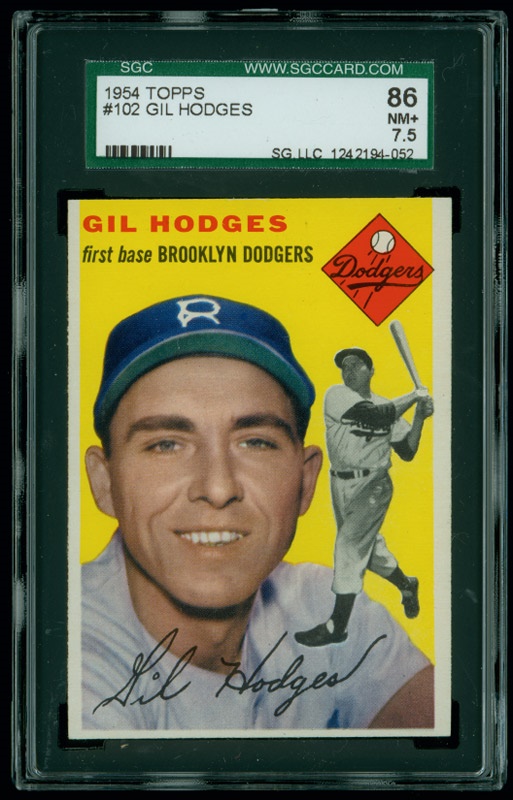 Gil Hodges, first base great played 18 of his 20 year career with the Dodgers. He died prematurely of a heart attack at age 48. This is his 1954 Topps card. It exhibits bold and vibrant color. Hodges’ swinging pose in B&W is standing on the shoulder of his full color portrait. Corners are crisp and card shows 60/40 right to left centering. SGC has graded it 86 NM+ 7.5.