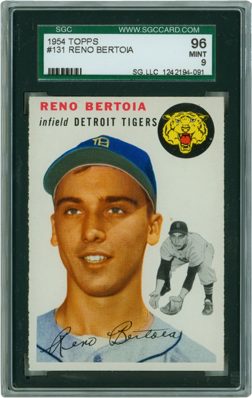 This is Reno Bertoia's mint 1954 Topps # 131 card as a member of the Detroit Tigers' infield. At the time, he was the only Italian born player in the majors. Card has square corners and vibrant color. Rated 96 Mint 9 by SGC.