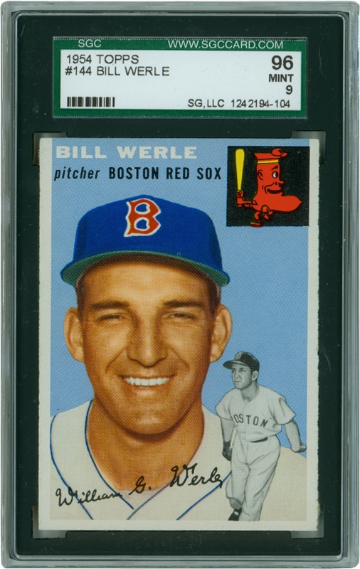 Bill Werle known as "Bugs" pitched in both The Pacific Coast League and Major Leagues. This is his mint 1954 Topps #144 card as a member of the Boston Red Sox pitching staff. Card shows even symmetry and bold color. Rated 96 Mint 9 by SGC.