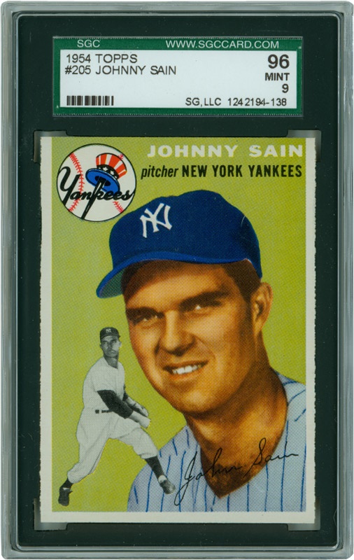 Johnny Sain was a right handed hurler known for teaming with Warren Spahn on the Boston Braves' late 1940's teams. He is a 3 year all-star and won three World Series Championships with the Yankees in 1951, 1952 and 1953. This is his mint 1954 Yankees Topps # 205 card. It shows beautiful rich color, square corners and is rated 96 Mint 9 by SGC.