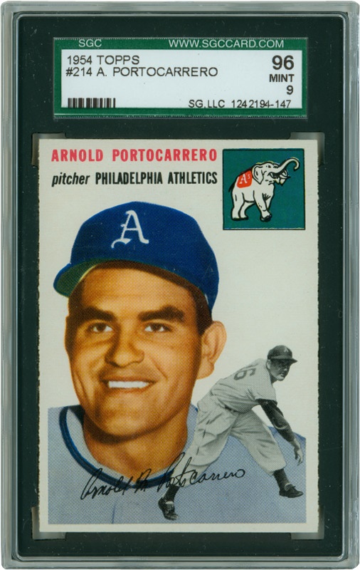 Arnold "Arnie" Portocarrero pitched in the majors from 1954-1960. This is his mint 1954 Topps # 214 card as pitcher for the Philadelphia A's. Card has four square corners, 55/45 right to left symmetry and rich color. SGC rated at 96 Mint 9.