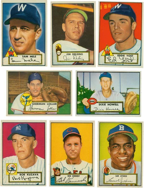 Collection of 1952 Topps baseball cards (87). All series are included except high numbers. There are several of the more scarce black backed low number cards. No major stars, but several minor stars such as Sam Jethroe, Ed Waitkus, Luke Easter, Ferris Fain, Gene Woodling and more. A few duplicates. 20% EX-MT or better, 60% VG-EX, 20% lesser.