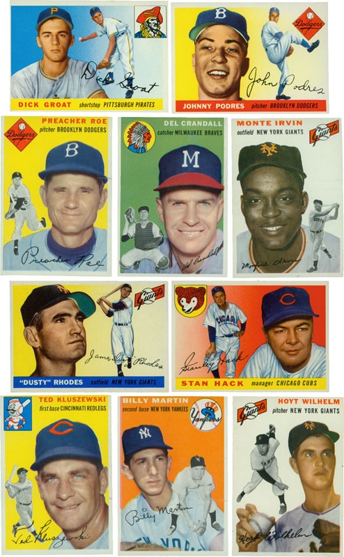 These cards were purchased in 1954/55, put away by the original collector and just returned to the hobby a few months ago when they were found in an estate.  All are packed fresh, show very little handling and most are almost as nice as the day that they were removed from the wrappers over 50 years ago.  There are (149) 1954 cards and (113) 1955 cards.  No huge names, but there are some minor stars and several Hall of Famers. All series are represented and there are a few duplicates.   90% EX-MT or better, 10% lesser.  This lot represents a great start on two great high end sets.