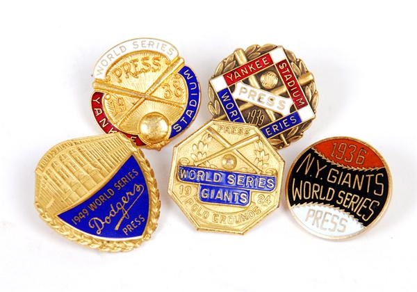 Includes 1924 Giants, 1936 Giants, 1938 Yankees, 1939 Yankees and 1949 Dodgers. All are stamped on the back by Deiges and Clust, except for the 1949 pin that was not issued with any stamping. All original with no restoration or replaced pieces. The 1939 pin is EX-MT, the rest NM-MT or better. Nice high grade lot!