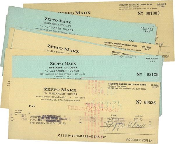 Fine lot of ten checks filled out and signed on Zeppo's business account. Each has been signed by Zeppo in blue ballpoint and date from the 1970's. EX-MT.