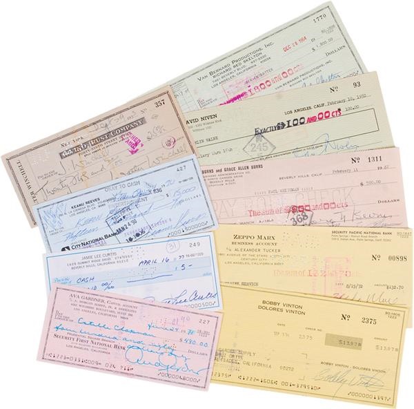 Includes George Burns (1942), Zeppo Marx (1972), Walter Winchell (1933), Richard Red Skelton (1964), J Paul Getty (1942), Warren Beatty double signed (1989), Keanu Reeves double signed (1990), David Niven (1950), Ava Gardner (1971), Cornel Wilde (1972), Bobby Vinton (1974), Sammy Cahn double signed (1974), Jamie Lee Curtis (1977), Ava Gardner (1979), Monty Woolley (1950), Charles Steinmetz (1904), Thomas Ferebee (1996), and three more. All have bold ink signatures and grade EX-MT or better.