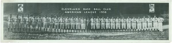 Printed photo on paper stock by S.A. Morrick, National Pres Pictures, Cleveland, Ohio. Measures 33" x 8 1/4" and is has several tears and some creases/wrinkles rendering it to VG condition. Comes with the original addressed and postage cancelled mailing tube. Panoramic depicts the 1936 Cleveland Indians Team.