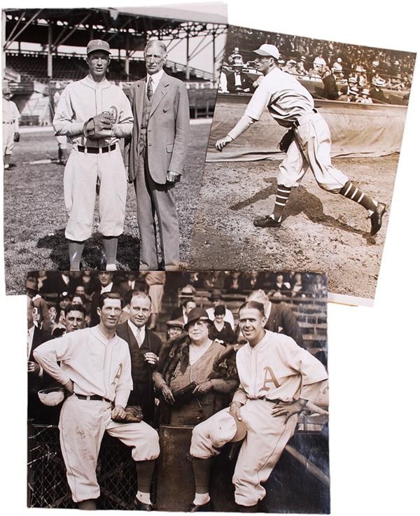 Includes: 1) Classic pitching pose, in the 1929 World Series. 2) Posed with meal ticket Connie Mack after just signing in 1932. 3) Famed image at the stands with VIP's and George Earnshaw at the 1931 World Series. Average 7x9'' and EX-MT. Original paper captions on versos.