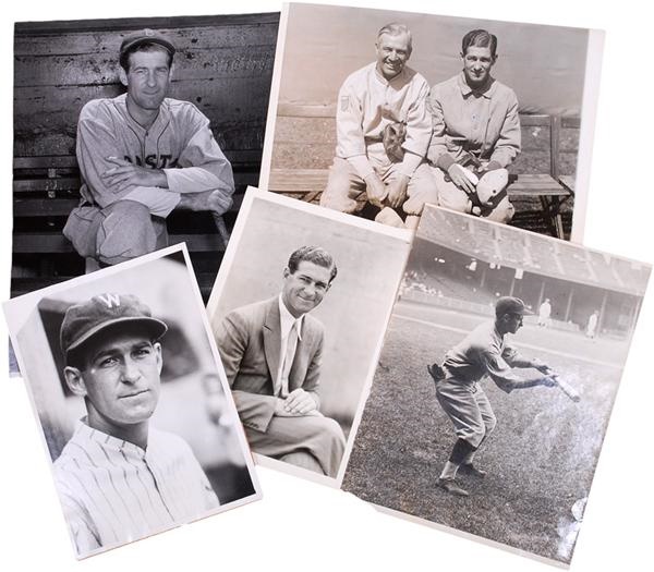 Some truly great stuff: 1) sitting on the bench with Tris Speaker, 2) 1925 batting pose, 3) wonderful civvies pose courtesy of the American League Service Bureau (1930), 4) stunning pose in a Boston uniform (1934), 5) last but not least definitive 1928 Senators pose after being named manager. Overall 6x8'' and EX-MT. Most with original paper captions on versos.