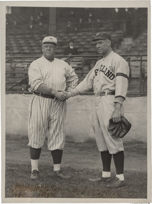 The two titans shake hands at Ebbets Field and each with a scar. Robinson's is on his face while Speaker wears his on his sleeve in remembrance of their fallen comrade Ray Chapman (killed in combat that season by a pitched ball). 8"x10''. EX-MT. Original paper caption on verso.