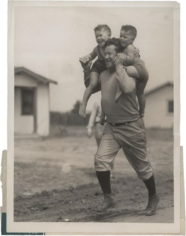 Jim Thorpe is in training carrying his kids on his back. The biggest kid of all. Underwood & Underwood wire photo. 7x9''. EX- MT. Original paper caption on verso