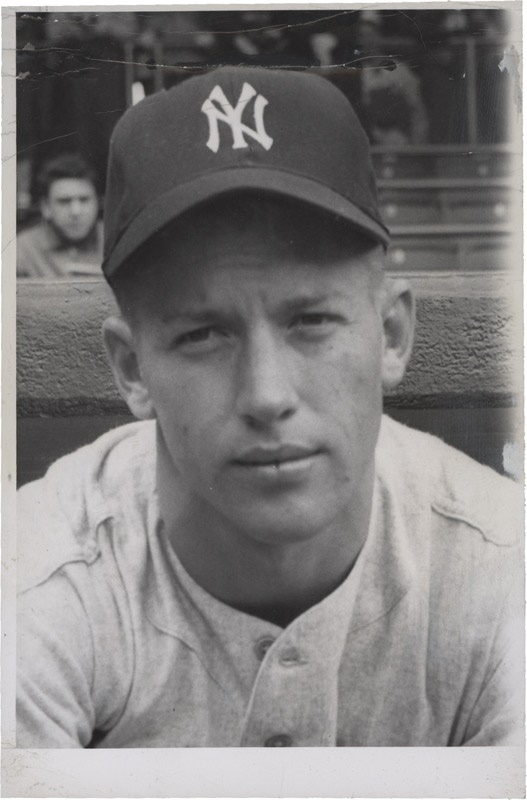 Rookie Mickey Mantle looks like he has the weight of the world on his shoulders. He does. 3.5x5''. VG-EX. Original paper caption on verso.
