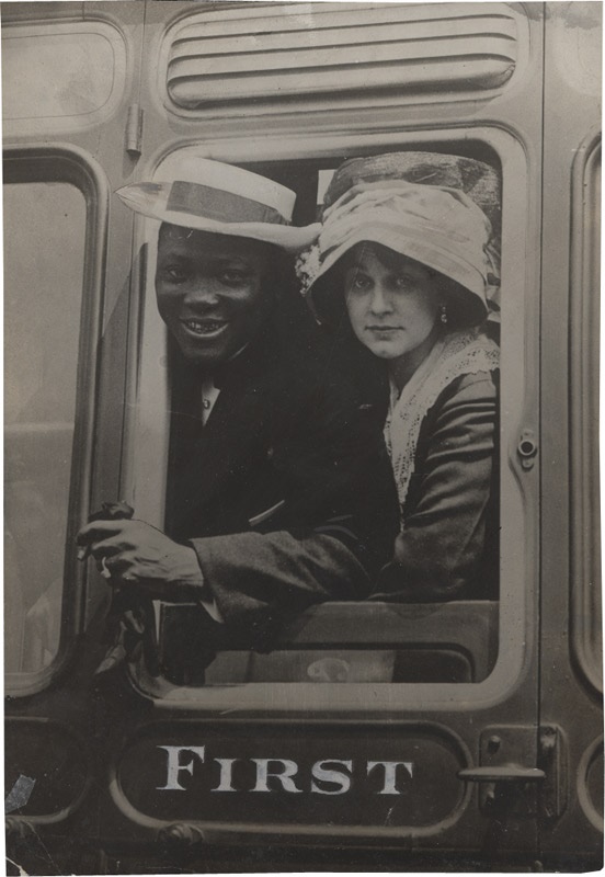 The controversial Johnson arrives in England with his white wife Etta Duryea for the coronation of George V. She would commit suicide soon after. 5x7''. EX+. Original paper caption on verso.