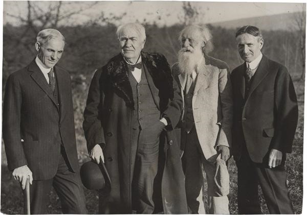 This famous gauntlet of friends would get together for camping trips in the woods: Thomas Edison, Henry Ford, John Burroughs and Harvey Firestone. 7x10''. EX+. Original paper caption on verso.