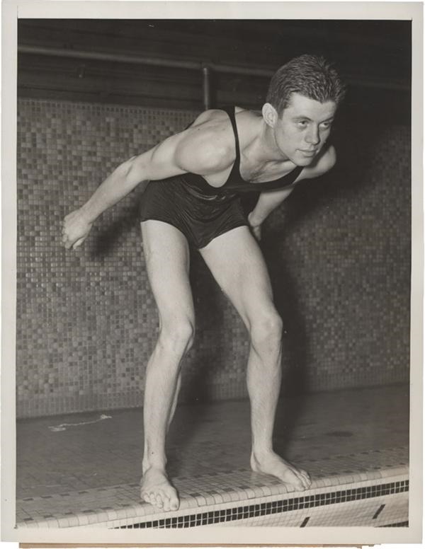 A twenty something Jack is shown swimming for Harvard. AP wire photo is 7.5x9.5''. EX-MT. Original paper caption on verso.