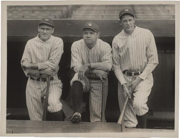 The murderous Yankee outfield of Bob Meusel, Earl Combs and Babe Ruth. 7x9''. NRMT. Original paper caption on verso.