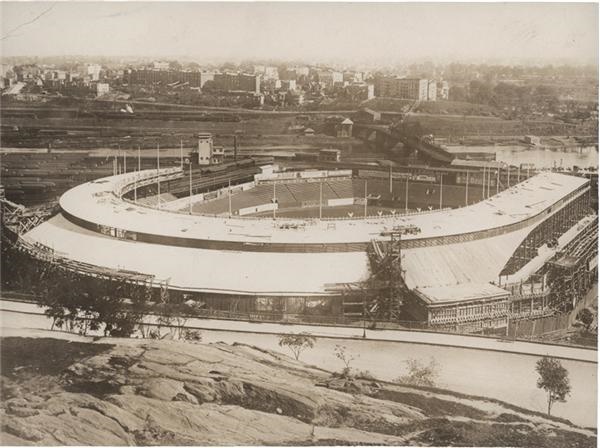Smashing view of the Polo Grounds where the Giants and Athletics will meet to decide the perennial baseball question. Double weight with original paper caption. 7x9''. EX.