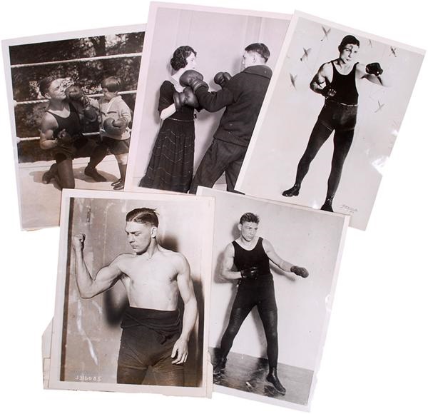 Five marvelous images include Greb: boxing with his wife; boxing with his daughter; during 1925 Apeda restrike; in a beautiful 1924 boxing pose; making a muscle (under threat of right arm loss due to blood poisoning in 1923). Average 6x8'' and EX+. Original paper caption on 3/5.