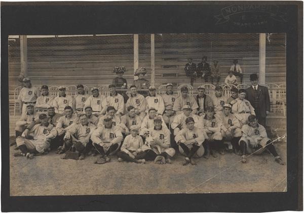 5.25 x 9'' photo on 7 x 10'' mount (scrapbook album cover) of the 1908 Detroit Tigers. Thirty members of the team are pictured along with the batboy and dog mascot. Clearly visible are Sam Crawford and Hugh Jennings. There are some creases and minor surface wear. The image, however, is crystal clear making identification of other players easy. A fantastic find for early Tiger's fans. VG.