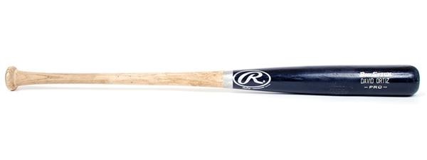 David "Big Papi" Ortiz is the leading Red Sox slugger. This is his 2006 game used bat. It is an Adirondack 34". It is un cracked with a 34 in sharpie on the knob and a 32 1/2 in pen, and etched in is 456B. 358 06. Nice use and light pine tar.