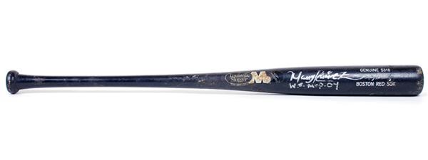 Louisville Slugger Manny Ramirez M9 Genuine S318 34" game used bat. Heavy pine tar. Signed by Manny with "WS MVP 04" written below his signature. There is a scuff through the inscription. Bat shows heavy game use.