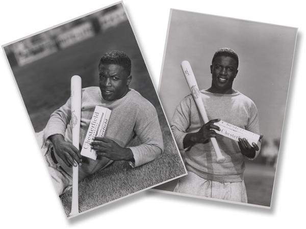 One lot of two original 7 x 10'' photographs of Jackie Robinson promoting the use of Chesterfield Cigarettes. Considering how prominently the H&B bat is displayed in each, it could almost be confused for a sporting goods advertisement. Photos of are the highest quality with Robinson pictured in all his crystal clear glory. Mint.