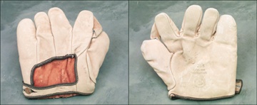 Magnificent condition store model glove dates circa 1910. In suede, the leather is still soft, fresh and the original tan color. On the front imprinted, "1036 Genuine Horsehide" with the Reach logo below. The imprinting is nice and bold. Brass button on the verso with "Reach" in red enamel paint. Some minor scuffing to the inside red leather. Overall strong EX+.