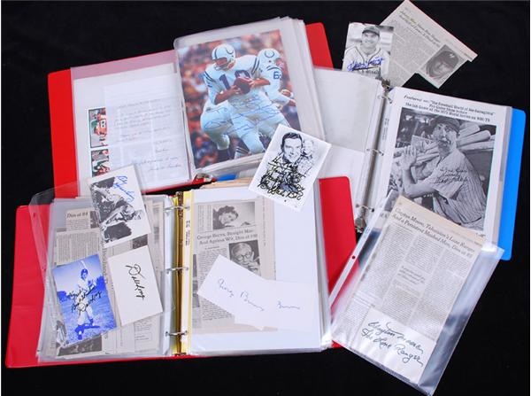 Large amassment (200+) of autographs spanning the celebrity, sports and historic realms. Includes signatures compiled with newspaper articles and obituaries of many acclaimed people. Also includes signed photos, letters, tickets, playbills, and other ephemera. Signatures include Red Auerbach, Gene Autry, Hank Bauer, Ron Burton, Herb Brooks, Jack Buck, Lou Boudreau, Angelo Bertelli, Don Budge, George Burns, Art Carney, Howard Cosell, Larry Doby, Bill Dickey, Otto Graham, Red Holzman, Tom Landry, Johnny Mize, Clayton Moore (Lone Ranger), Wellington Mara, Murray Murdoch, Al McGuire, Byron Nelson, Lindsey Nelson, Walter Payton, Pee Wee Reese, Roy Rogers, Bill Shoemaker, Hank Stram, James Stewart and many others. This is an interesting and historic collection that has been meticulously compiled over the years and is one you will spend hours leafing through while waxing nostalgic.