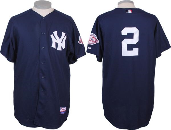 Lightweight, polyester baseball jersey game used by New York Yankee star, Derek Jeter, during Spring Training in 2003. The jersey has a heat pressed Majestic Authentic label on the left front tail and the MLB logo is embroidered at the back of the collar. A Yankees 100th anniversary patch has been stitched to the left sleeve. The Yankee logo on the front left chest and "2" on the back are stitched on in tackle twill. Flag tag "48", indicating size, is sewn into the outer left side seam. Wash instructions sewn into the inner, left side seam. Nice use overall, for a spring training jersey, with pilling and pulls.