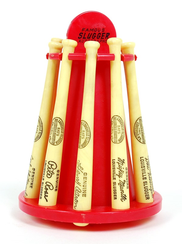 Fun bank celebrating a 1960's American League All-Star team. Ten mini H&B bats with player names surround a red bat rack with a coin slot in the middle. Players include: Bench, Yaz, Rose, Aaron, Mantle, Kessinger, Oliva, Fosse, Clemente and F. Robinson. The plastic of the bats are yellowed, but overall the bank is excellent condition.