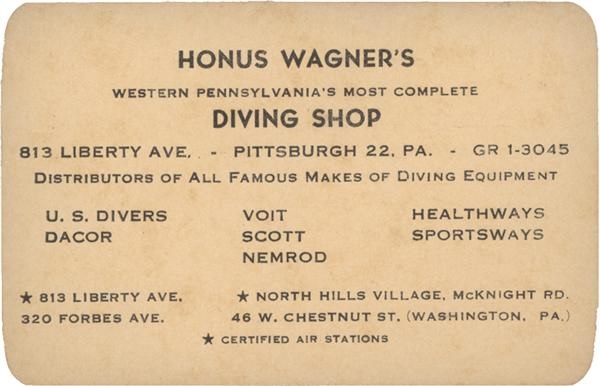 Honus Wagner’s Diving Shop, known as "Western Pennsylvania's most complete diving shop", was located at 813 Liberty Ave, in Pittsburgh, PA. This is a discount card that was issued to preferred customers. It is 4" x 2 1/2" in VG-EX condition and dates to the 1960's.