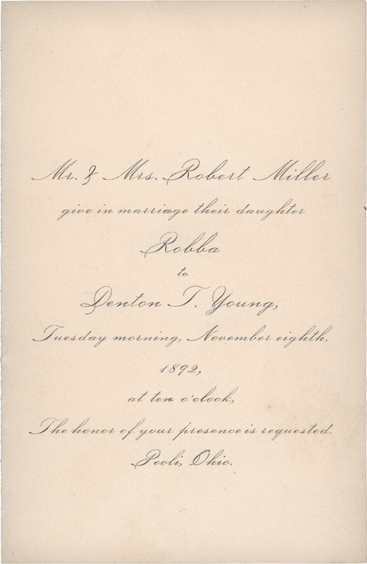 "Mr. & Mrs. Robert Miller give in marriage their daughter Robba to Denton T. Young, Tuesday morning, November 8th, 1892, at ten o'clock". These are the words on Cy Young's wedding invitation. It measures 3 3/8" x 6 1/2" folded. The front panel containing all of the type is EX however the back folding panel has two holes, although the pages are blank with no type so it is easily "framed out".