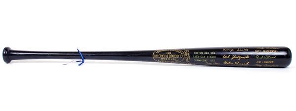 The 1967 "Impossible Dream" Red Sox season culminated with a World Series game 7 loss to the St. Louis Cardinals. At the beginning of the season not much was expected out of the Red Sox. However they surprised everyone, including their own fans, by finishing in first place, one game ahead of the second place (tied) Tigers and Twins. This is an H&B commemorative black bat imprinted in green "Boston Red Sox American League Champions 1967". It is also imprinted in gold lettering with all of the players including Jim Lonborg, Elston Howard, Tony Conigliaro, Carl Yastrzemski, Ken Harrelson, Rico Petrocelli, Sparky Lyle, and coaches Sal Maglie and Bobby Doerr as well as manager Dick Williams (only name in green). Bat is NRMT+.