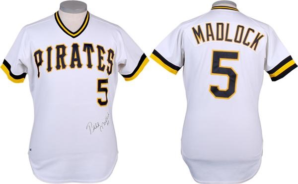 Home white jersey is all original with name sewn on a plate on the back. Number 5 on the front and back. Rawlings size 44 and Set 1 1982 tagging in the collar. "5 82 1" strip tag sewn on front tail. Signed on the front in black by Madlock. Nice use.