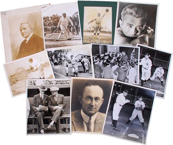 Super collection of vintage photos including (7) Ruth, (1) Mack (with Ruth), (1) Cap Anson, (2) Ty Cobb and (1) James Dean. Even with fake signatures on each of them, still an incredible visual assortment. One each of the Cobb, Anson and Dean photos are nice studio portraits. There is one with the Babe and his manager Connie Mack sitting together and several action shots of the Sultan of Swat.