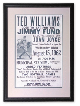 The game's greatest hitter ever lends his recently retired bat to charity. Wonderful boxing-style poster has considerable restoration, but the rarity of the piece (likely the last one surviving) makes it a winner. Professionally matted and framed. Some restoration is virtually undetectable. A visual beauty.