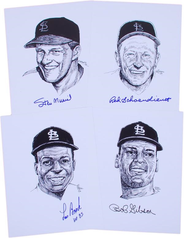 St. Louis artist, Dan Martin, created these (4) images of Cardinal Hall of Famers. The 8x10's are photos of Martin's works and are mint signed by each player. They include: Stan Musial, Bob Gibson, Lou Brock & Red Schoendienst.
