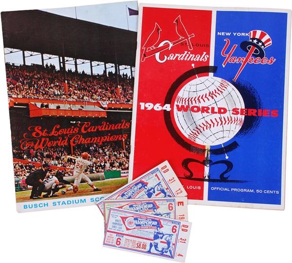 It was great to be a Cardinals fan in the 60's. Here's some proof: - (3) 1964 World Series ticket stubs from games 1 & 6 (2). VG to EX - 1964 World Series program, Cardinals vs. Yankees. EX . Scored - 1965 Cardinals Score Card celebrating '64 World Championship. VG+. Unscored