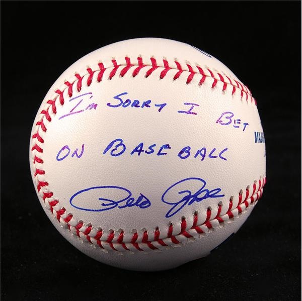 This snow white official major league (Selig) ball is humorously inscribed in blue ball point with the epithet "I'm Sorry I bet on Baseball" with a mint quality Pete Rose signature. The ball is numbered 83/303 and has a Ballpark, Pete Rose Collectibles sticker affixed to it. The ball is encased in lexan and is in top quality condition.