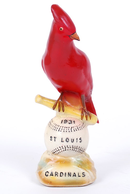 This 11" chalkware statue celebrates the 1931 World Series Champion St. Louis Cardinals. Circa 1940, the design has a Cardinal sitting on a bat balanced on a baseball. The lettering says, "1931 St Louis Cardinals". The paint and finish are EX with only a bit of dirt around the ball and slight chipping around the base.