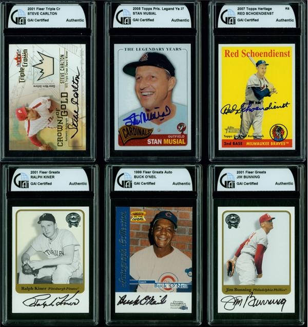 Includes 2001 Fleer Triple Crown Steve Carlton, 2005 Topps Pris Legend Stan Musial, 2007 Topps Heritage Red Schoendienst, 1999 Fleer Greats Autographs Buck O'Neal, 2001 Fleer Greats Jim Bunning and 2001 Fleer Greats Ralph Kiner. All were issued by the respective companies as autographed cards and are encapsulated by GAI and authentic. Mint.