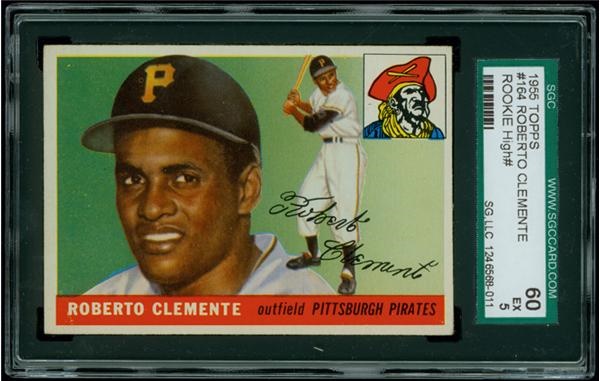 Roberto Clemente's last regular season hit was his 3000th in September of 1972. It was the culmination of a brilliant career that ended too soon. This is Clemente's rookie card from 1955. It is a high number Topps #164 and is SGC encapsulated and rated at 60 EX 5.