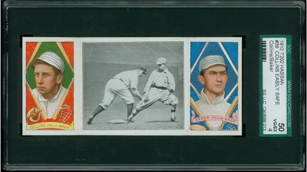 HOFers Eddie Collins and Frank "Home Run" Baker helped lead the Philadelphia A's to three World Championships; in 1910, 1911 and 1913. This is a 1912 T202 Hassan #39 Collins Easily Safe. It is SGC rated 50 VG/EX 4. However it presents much nicer than it grades, with pristine sharp corners, a nice verso, strong bold color and even symmetry.
