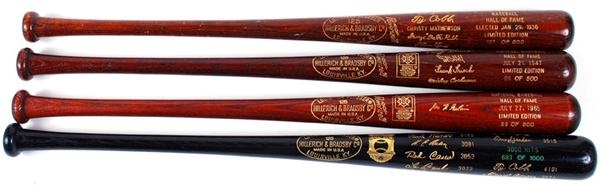 Collection of EX-MT HOF H&B bats (4) including a "First Five" numbered 107 of 500 for Ruth, Mathewson, Wagner, Johnson and Cobb. There is also a 3000 hit club including Clemente, Kaline, Cobb, Mays, Speaker and others numbered 683/1000, a class of 1947 with Grove, Frisch, Cochrane and Hubbard numbered 89/500 and lastly a Pud Galvin numbered 89/500.